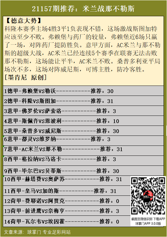 科隆本赛季主场4胜3平1负表现不错,这场激战斯图加特应该至少不败。弗赖堡与药厂的较量,弗赖堡近6场只赢了一场,对阵药厂提防胜负。意甲方面,AC米兰与那不勒斯的超级大战,AC米兰已经连续5个赛季在联赛无法击败那不勒斯,这场能让平半,AC米兰不败。桑普多利亚平局场次不多,这场对阵威尼斯,可博主胜,防冷客胜。