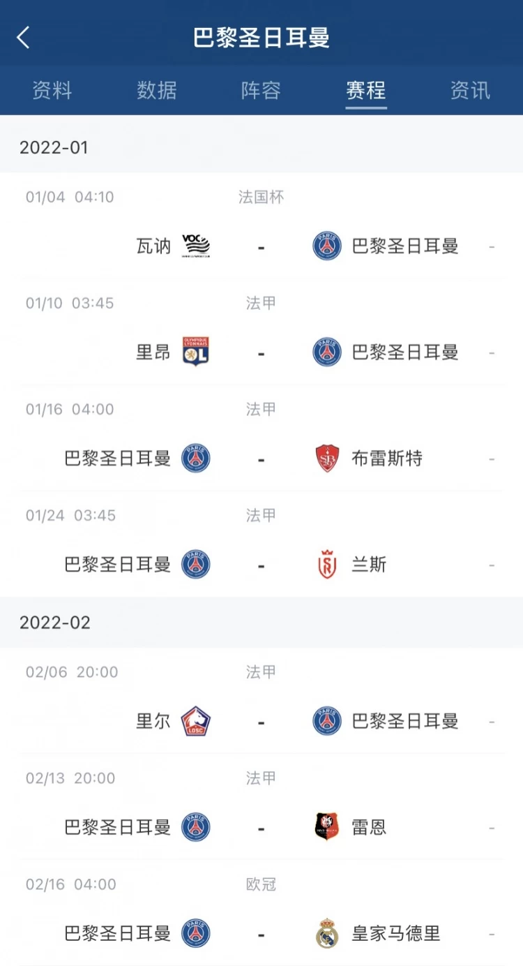 巴黎近期赛程↓