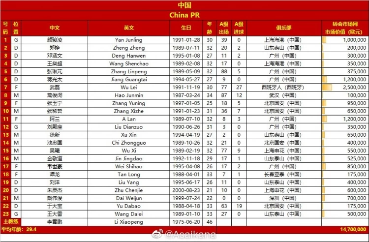 前锋:7-武磊、9-张玉宁、11-阿兰、17-韦世豪、18-谭龙