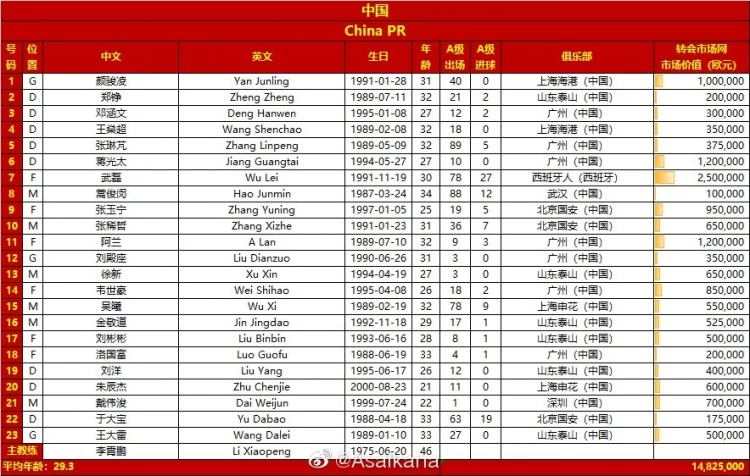 前锋:7-武磊、9-张玉宁、11-阿兰、14-韦世豪、17-刘彬彬、18-洛国富