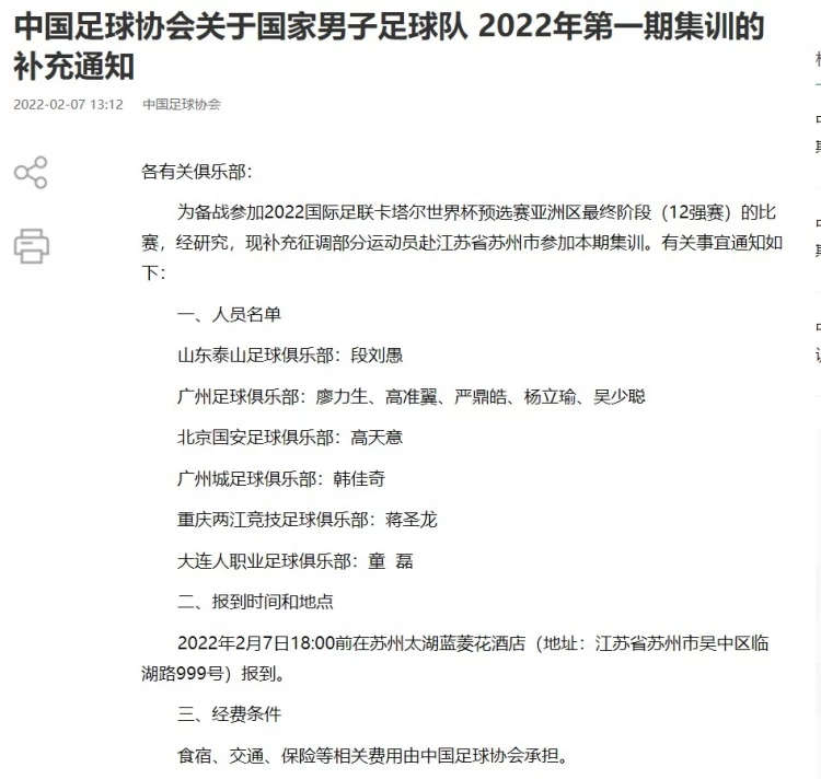 为备战参加2022国际足联卡塔尔世界杯预选赛亚洲区最终阶段(12强赛)的比赛,经研究,现补充征调部分运动员赴江苏省苏州市参加本期集训。有关事宜通知如下: