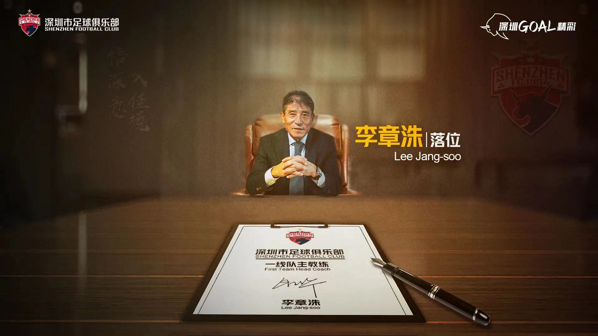 为持续提升球队战斗力,深圳市足球俱乐部经与市相关部门、股东及战略合作伙伴讨论商议决定,即日起聘请李章洙(Lee Jang-soo)先生担任一线队主教练。