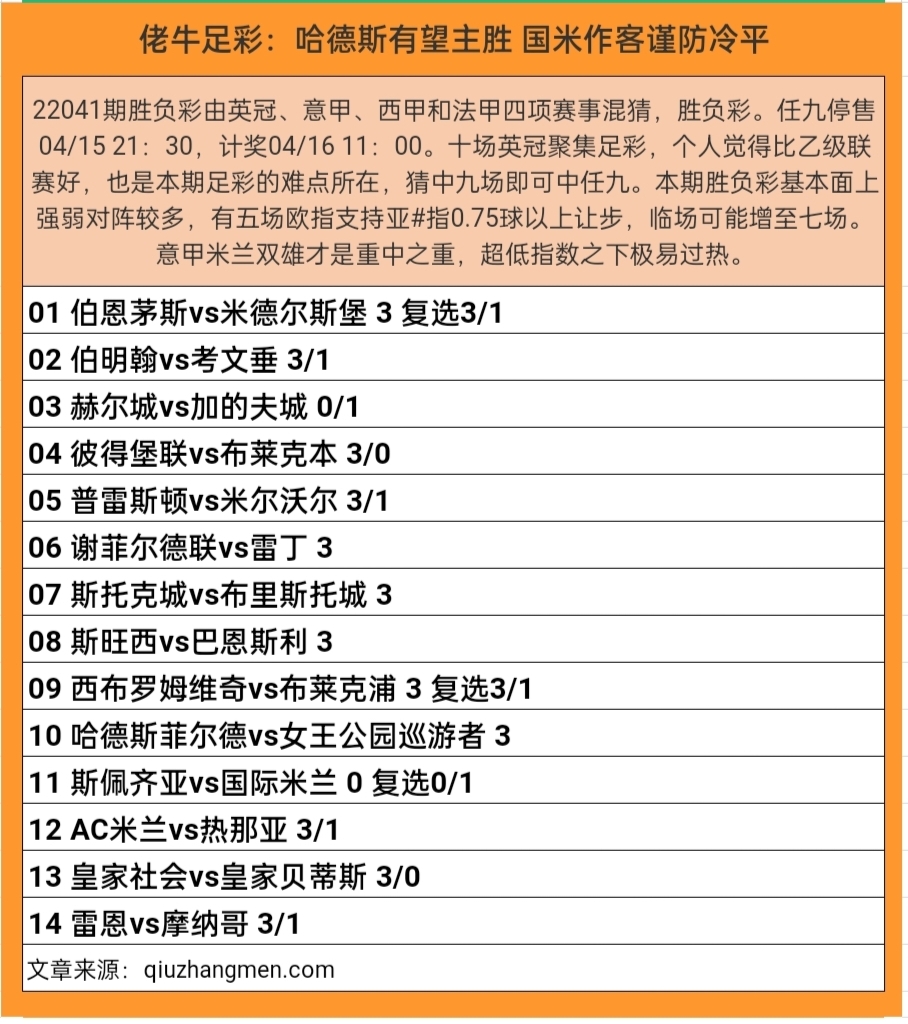 首页/ 赛事正文上期四大杯赛足彩中,四场欧冠主队3平1负热门不胜,即使切尔西常规一赔客胜都是心理冷门,为提升奖金成色推波助澜。22041期胜负彩由英冠、意甲、西甲和法甲四项赛事混猜,胜负彩。任九停售04/15 21:30,计奖04/16 11:00。十场英冠聚集足彩,个人觉得比乙级联赛好,也是本期足彩的难点所在,猜中九场即可中任九。本期胜负彩基本面上强弱对阵较多,有五场欧指支持亚#指0.75球以上让步,临场可能增至七场。意甲米兰双雄才是重中之重,超低指数之下极易过热。