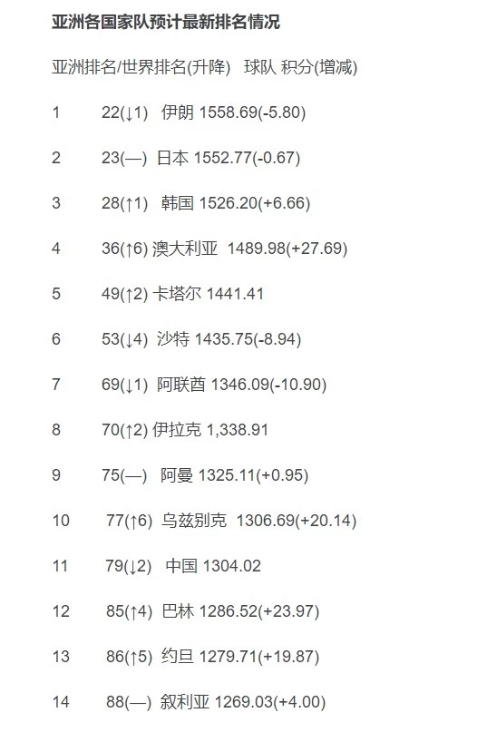 中国队由于一场国际A级赛未赛,积分未有变化。目前,中国队可以获得国际足联技术积分的赛事就只剩下下个月在日本进行的东亚杯赛。但面对韩、日这样的对手,中国队如果无法战胜或战平对手,输球的话,反而要被扣除技术积分。所以,想要维系甚至超越目前的积分排名、重新跻身亚洲前十名,下个月的东亚杯赛还是相当重要的。最为关键的是,如果中国足球不尽快恢复正常的国际间交流,则发展之路与前景将变得更为困难。更为重要的是,这个国际足联排名将是未来2023年亚洲杯小组赛分组抽签时的分档依据,尽管迄今为止,亚足联尚未公布分档依据与原则,毕竟这届赛事的东道主也还未能敲定。