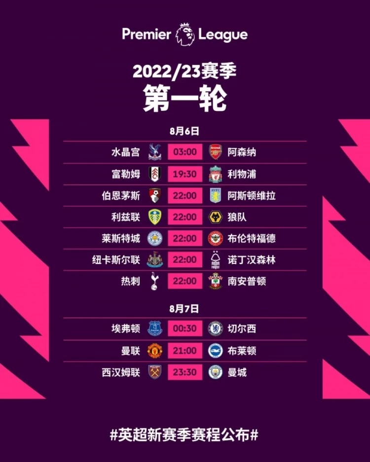 2022/23赛季英超赛程如下: