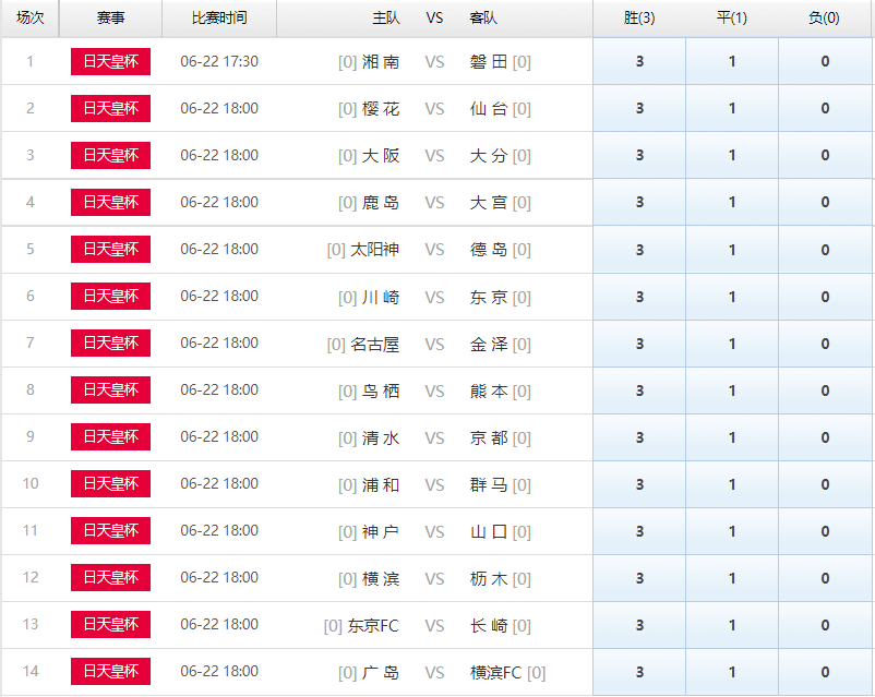 足彩第22072期14场天皇杯比赛对阵主客场一览: