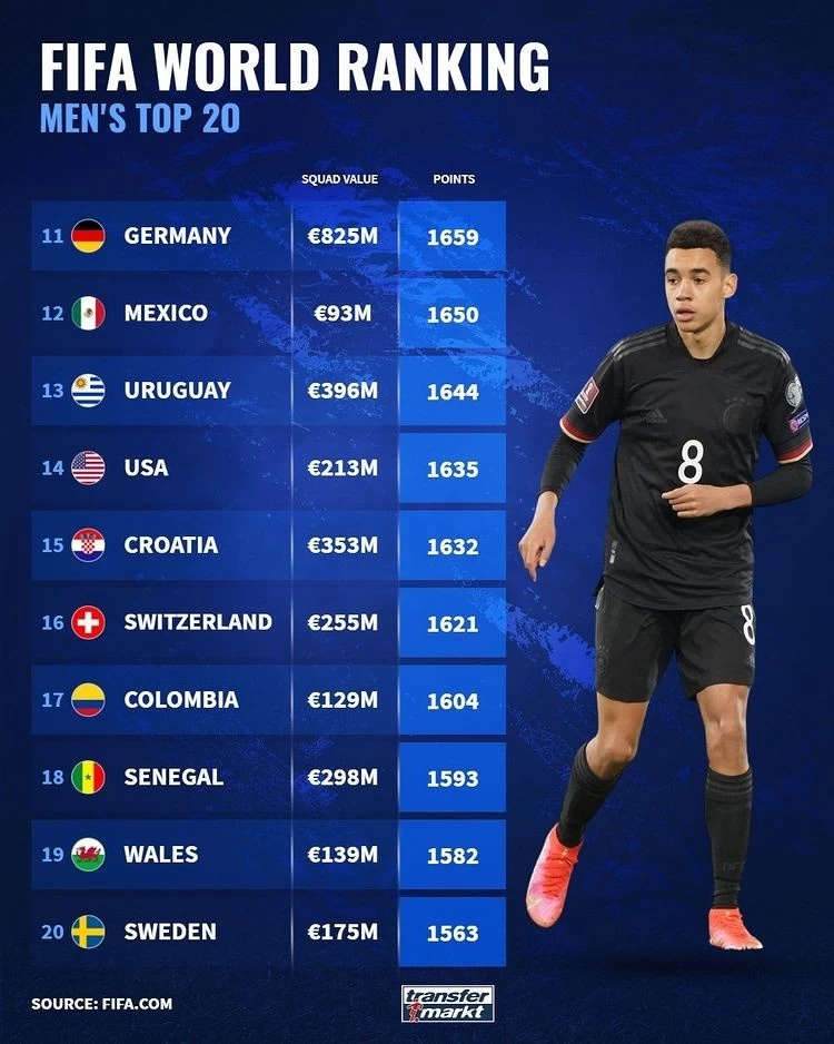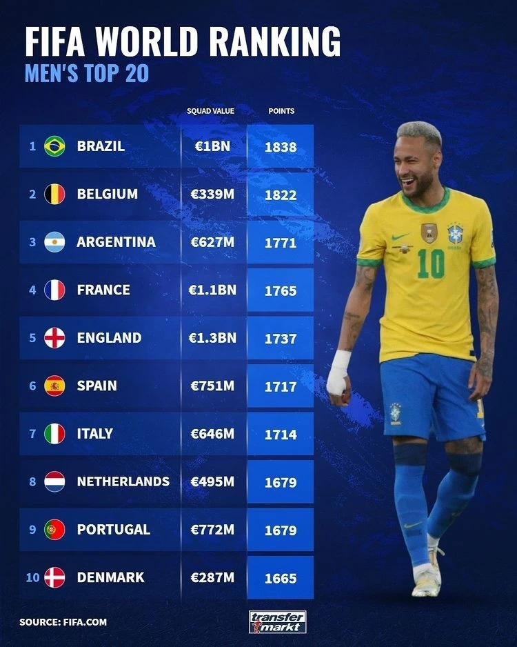 首页/ 赛事正文球掌门6月24日获悉:日前,德转盘点了FIFA积分排名前20国家队的身价,排名第一的巴西10亿欧身价,排名第4的法国11亿欧身价,排名第5的英格兰13亿身价。