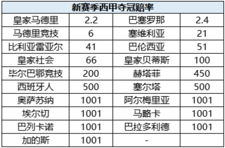 另外,上个赛季皇马凭借26胜8平4负的战绩斩获联赛冠军,巴萨、马竞、塞维利亚分列2-4位。而随着新赛程的公布,机构也即时给出了新赛季的西甲夺冠赔率,皇马1赔2.2仍是夺冠的最大热门,巴萨1赔2.4紧随其后,而马竞的1赔6以及塞维利亚的1赔21,已经与前两位拉开了差距。