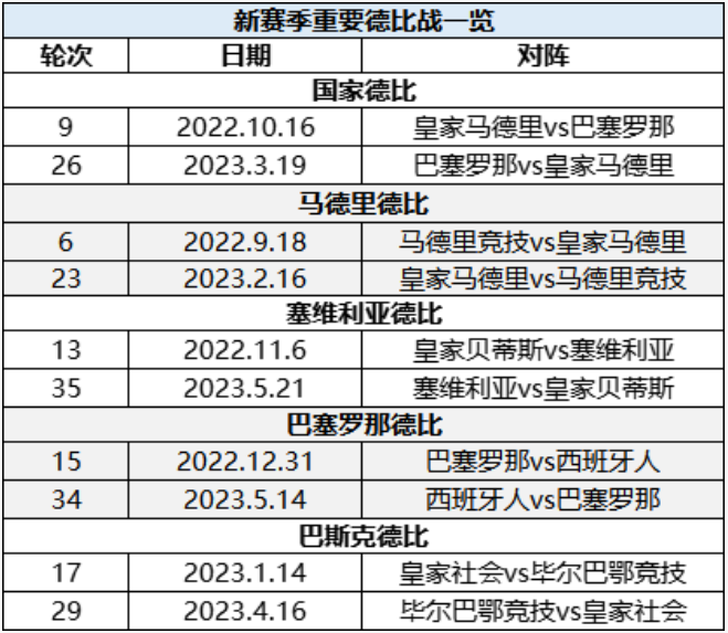 22-23赛季西甲联赛8月13日正式开战,收官日为2023年6月4日,同样横跨295天。间歇期方面,西甲联赛将在第14轮(11月9日)后休战,第15轮(12月31日)重启,休赛时间达52天。