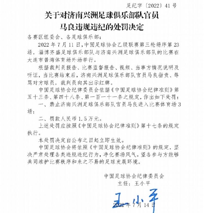 7月14日,中国足协开出罚单,对中乙济南兴洲俱乐部官员马良辱骂裁判禁赛3场罚款1.5万。