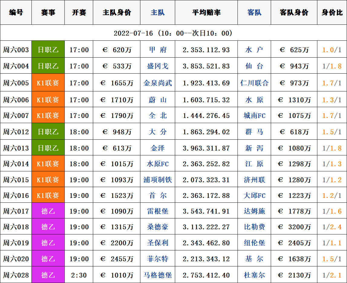 球掌门7月16日赛事|竞彩球队对阵身价数据汇总表