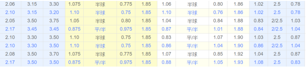 初始数据大部分都以0.5球高回报区间态度起步,后市早早来到了0.25球低回报区间,亚洲数据死撑在0.5球高区间没有和欧洲数据校正。