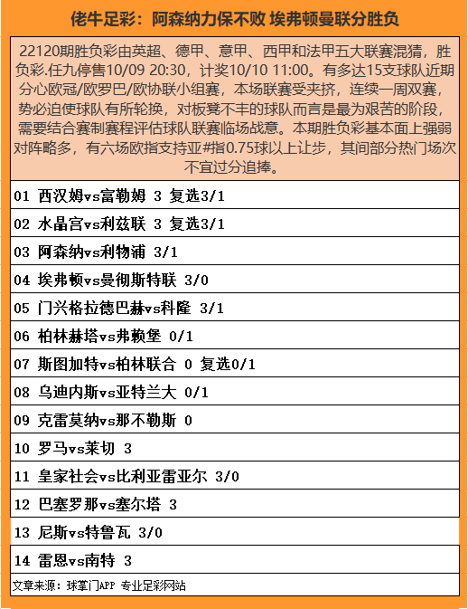 首页/ 赛事正文22120期胜负彩由英超、德甲、意甲、西甲和法甲五大联赛混猜,胜负彩.任九停售10/09 20:30,计奖10/10 11:00。有多达15支球队近期分心欧冠/欧罗巴/欧协联小组赛,本场联赛受夹挤,连续一周双赛,势必迫使球队有所轮换,对板凳不丰的球队而言是最为艰苦的阶段,需要结合赛制赛程评估球队联赛临场战意。本期胜负彩基本面上强弱对阵略多,有六场欧指支持亚#指0.75球以上让步,其间部分热门场次不宜过分追捧。