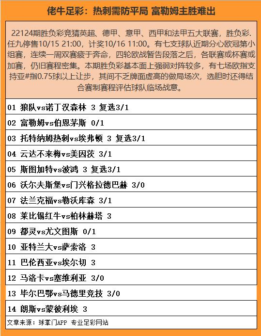 首页/ 赛事正文22124期胜负彩竞猜英超、德甲、意甲、西甲和法甲五大联赛,胜负彩.任九停售10/15 21:00,计奖10/16 11:00。有七支球队近期分心欧冠第小组赛,连续一周双赛疲于奔命,四轮欧战暂告段落之后,各联赛或杯赛或加赛,仍旧赛程密集。本期胜负彩基本面上强弱对阵较多,有七场欧指支持亚#指0.75球以上让步,其间不乏牌面虚高的做局场次,选胆时还得结合赛制赛程评估球队临场战意。