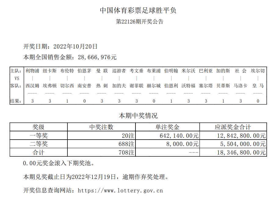 首页/ 赛事正文北京时间10月20日,胜负彩第22126期开奖结果揭晓。本期一等奖开出20注,单注奖金64.2万余元,二等奖开688注8000元,任九9877注1843元。本期胜负彩销量为28,666,976元,任九投注总额为28,450,290元。