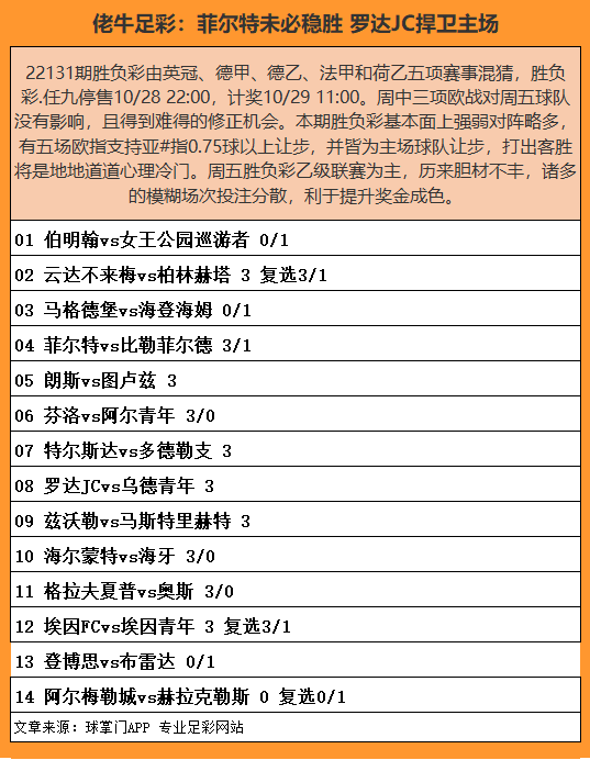 首页/ 赛事正文22131期胜负彩由英冠、德甲、德乙、法甲和荷乙五项赛事混猜,胜负彩.任九停售10/28 22:00,计奖10/29 11:00。周中三项欧战对周五球队没有影响,且得到难得的修正机会。本期胜负彩基本面上强弱对阵略多,有五场欧指支持亚#指0.75球以上让步,并皆为主场球队让步,打出客胜将是地地道道心理冷门。周五胜负彩乙级联赛为主,历来胆材不丰,诸多的模糊场次投注分散,利于提升奖金成色。