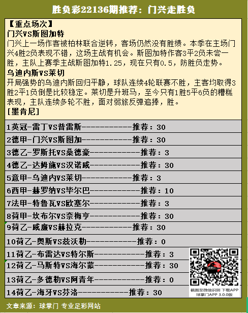 首页/ 赛事正文胜负彩2022135期竞猜德意西法早场+荷乙为主,本期11月4日(周五)22点00分截止,敬请留意。