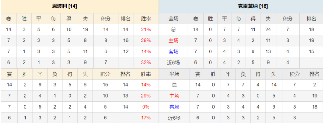 主队恩波利一直是意甲下游球队,近些年也是在意甲和意乙升降了几次,本赛季表现还是那样平平无奇。客队克雷莫纳是本赛季升班马,整体实力非常有限,在意甲不具备竞争力所以难以生存,这跟上赛季的威尼斯有些相似,本赛季7平7负至今无一胜绩,场均0.79球的火力和场均丢1.71球的后防是问题的关键所在。好在其上轮面对AC米兰还是能够严防死守住一个平局,面对强队也能够有一丁点的抗性。