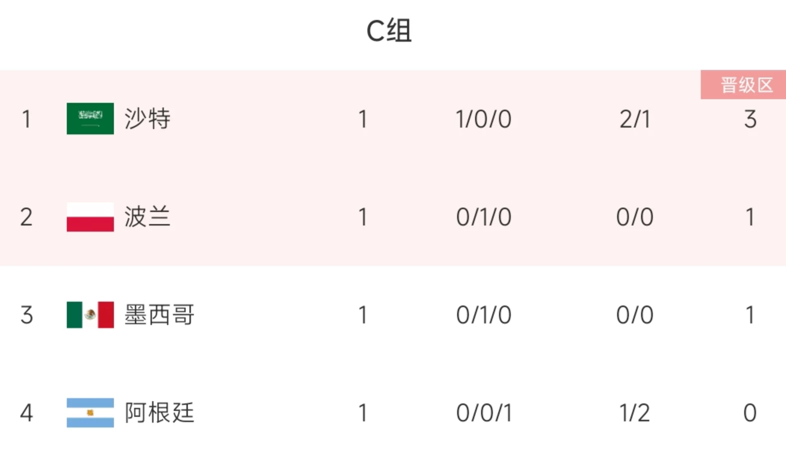 此时,没有球队出线,也没球队出局。阿根廷末轮就算赢球,也要看沙特vs墨西哥赛果。阿根廷失去出线主动权。