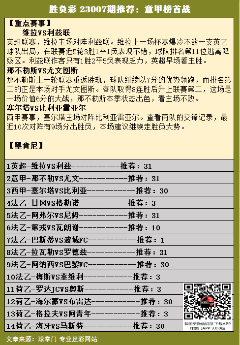 首页/ 赛事正文胜负彩2023007期竞猜法乙+荷乙赛事为主,本期1月13日(周五)22点00分截止,敬请留意。