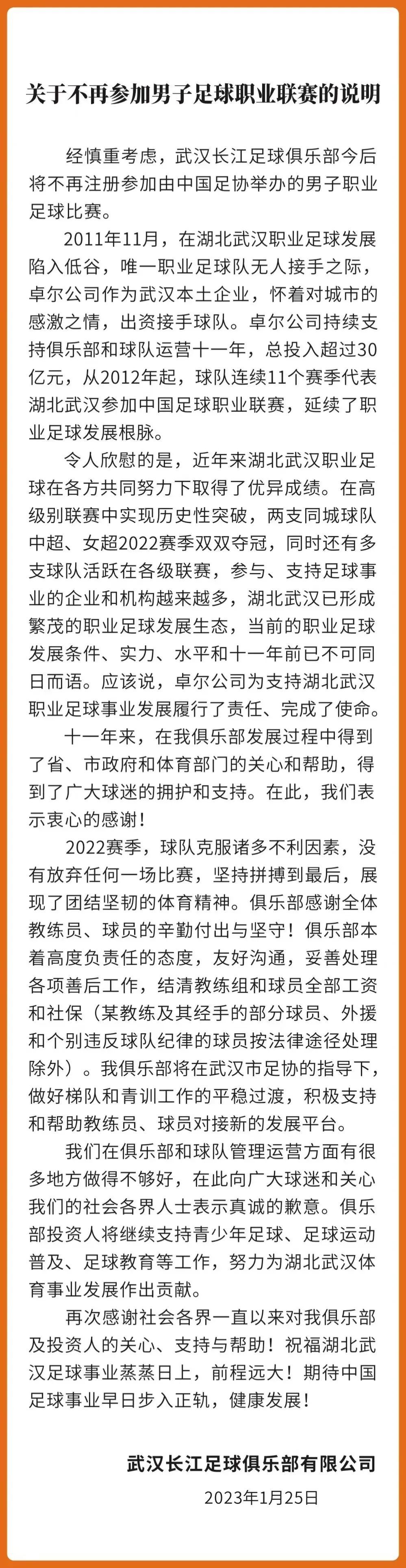 经慎重考虑,武汉长江足球俱乐部今后将不再注册参加由中国足协举办的男子职业足球比赛。