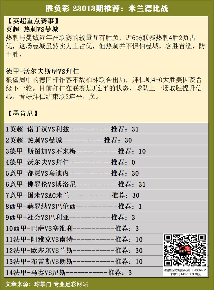首页/ 赛事正文胜负彩2023014期竞猜五大联赛组合,本期2月5日(周日)21点30分截止,敬请留意。