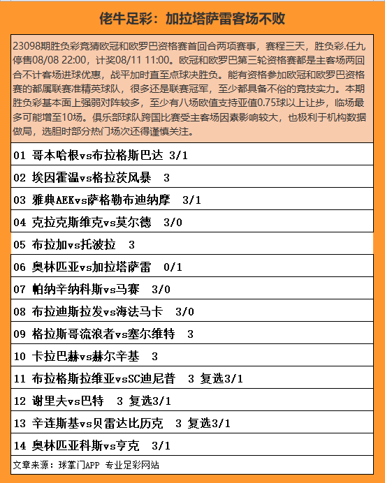 奥林匹亚[斯文甲6]为上赛季联赛冠军而获得欧冠一轮资格赛席位,新赛季即开启多线作战,近六场赛事4胜1平1负战绩中,联赛两轮客负主胜各一场,上两轮欧冠资格赛3胜1平不败晋级,上轮客平主胜不败淘汰保超卢多戈雷茨;加拉塔萨雷[土超1]为上赛季联赛冠军而获得欧冠二轮资格赛席位,新赛季包括热身赛近六场赛事2胜2平2负战绩中,上轮欧冠资格赛客平主胜不败淘汰立陶宛萨尔基。两队远在2012赛季友赛一场奥林匹亚主场受0.75球爆冷门1-1战平。欧值99家平均5.04↑ 4.03 1.59支持客让0.75球低值显得牌面虚高。主流机构胜平两项离散奥林匹亚得分不易,近似终指作客球队不败居多。足彩复选0/1。