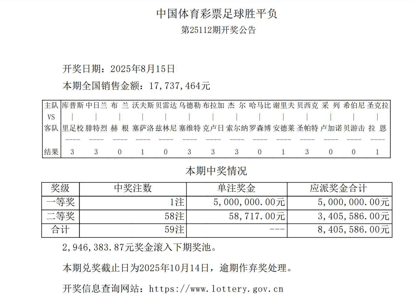 首页/ 赛事正文北京时间8月15日,胜负彩第25112期开奖结果揭晓。本期一等奖仅开出1注,单注奖金5,000,000元,294万滚存至8月15日晚停售的第25113期竞猜;二等奖开出58注,单注奖金58,717元;任九开出816注,单注奖金11,311元。本期足彩销量为17,069,880元,任九投注总额为14,526,384元。