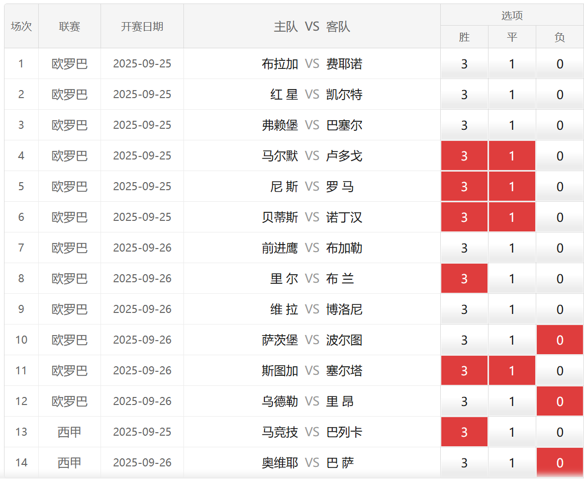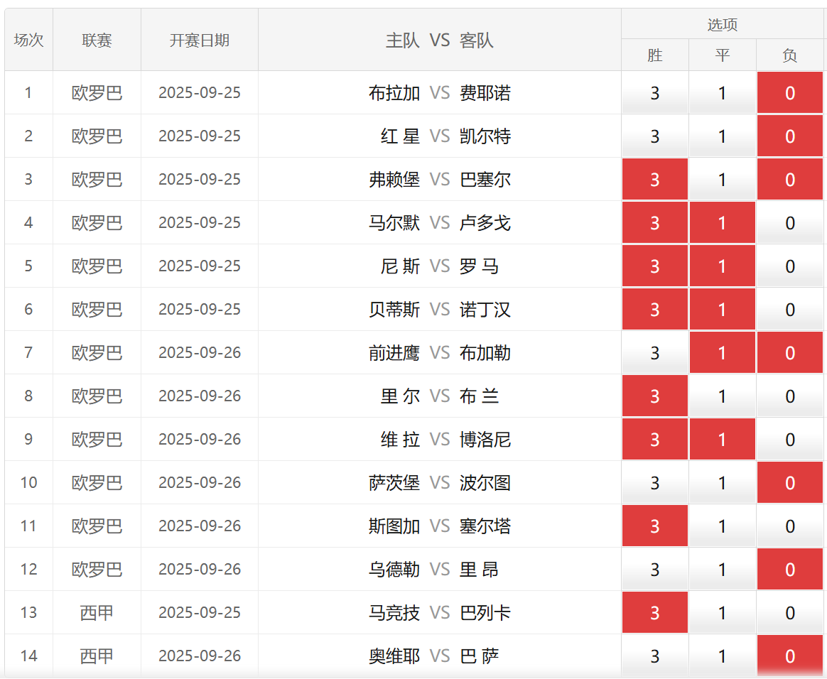 13,马德里竞技VS巴列卡诺,西甲第6轮的比赛,在周末第5轮里, 马德里竞技客场1:1与马洛卡打成平手,近二场比赛1平1负,联赛1胜3平1负积6分排第12名;巴列卡诺主场1:1平塞尔塔,近三场比赛仅获得2平1负,目前联赛1胜2平2负积5分排第14名;两队近10次交手里,马德里竞技获得8胜2平不败的成绩,主场自2011年12月份至今11次交手更是获得10胜1平,本场给出马德里竞技让一球,马竞本赛季主场2场1胜1平,巴列卡诺二场客场全输掉。胜