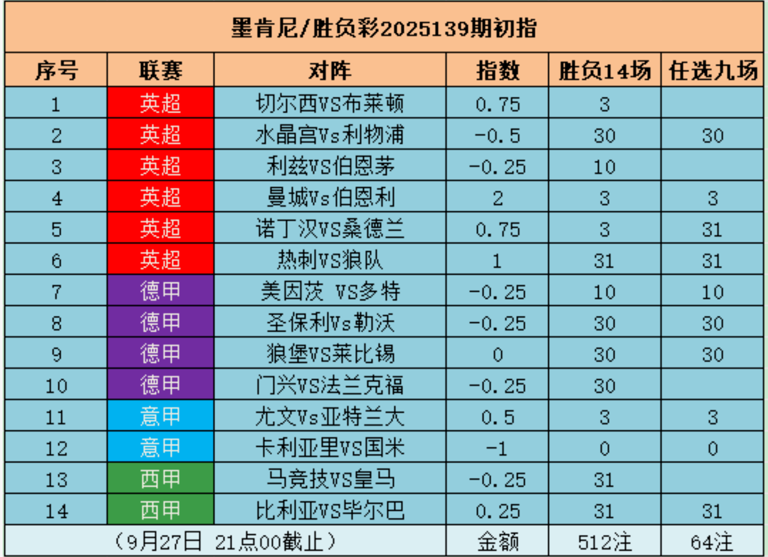 胜负彩2025139期英超+德甲为主,本期9月27日(周六)22:00截止,敬请大家留意。