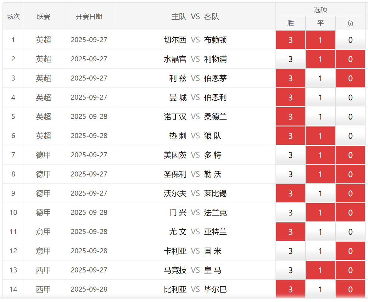 【提示】胜负彩25139期由四大联赛组成。本期难度系数较高。【英超】曼城胆胜,森林主胜可搏,蓝军红军皆需补平,热刺也有不胜可能。【德甲】多特、法兰克福与药厂客场不败可能性高,莱比锡与狼堡有待临场观察。【意甲】尤文与国米有望齐取三分。【西甲】马德里德比大战皇马不败,黄潜主场不胜则负。