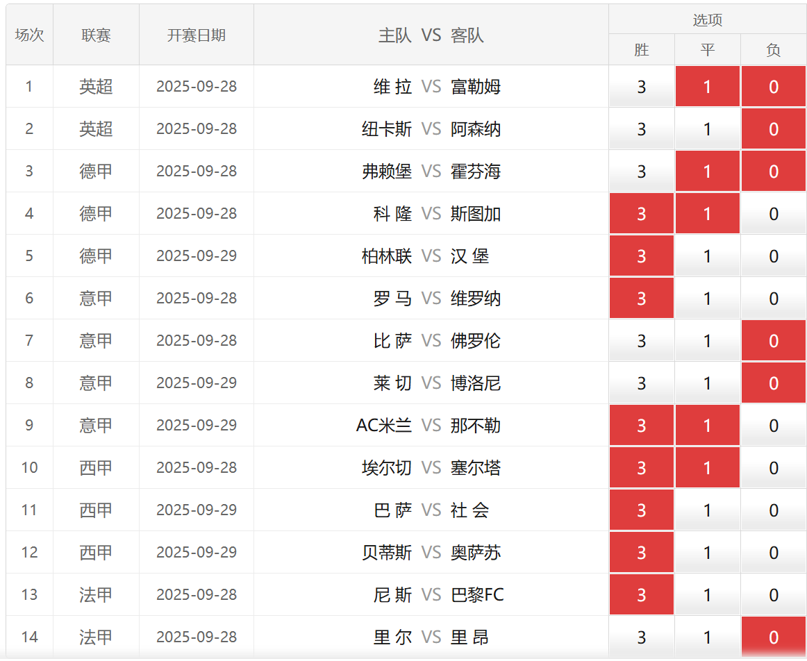 周日的25140期的足彩14场比赛由传统的五大联赛构成,截止时间是9月28日20:30,敬请留意。