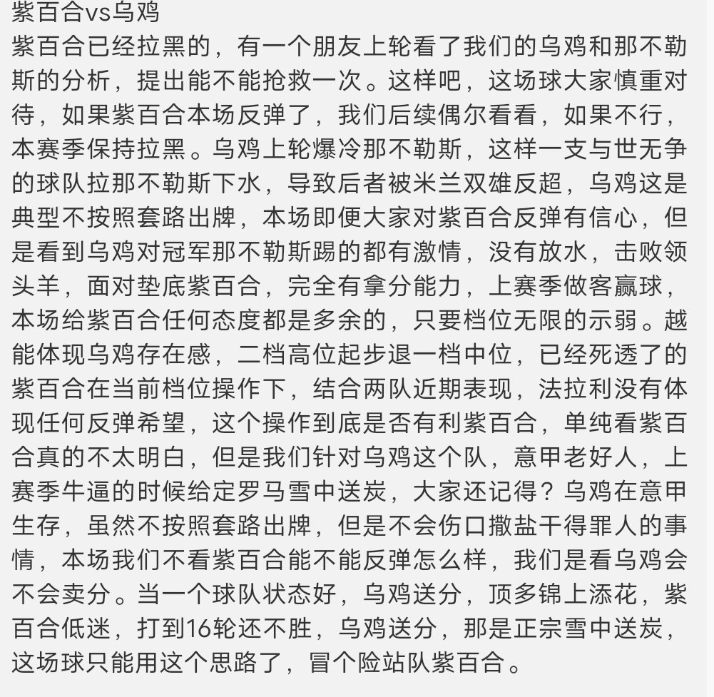 紫百合终于胡牌了,真的是要了血命,乌鸡雪中送炭。没想到紫百合赛季第一胜,居然是乌鸡卖分。并不是紫百合分析的对,而是乌鸡分析的对。意甲乱不乱,乌鸡紫百合说了算