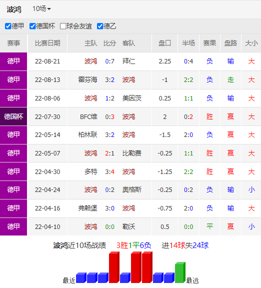 波鸿目前0胜0平3负积0分位列德甲积分榜第18位。波鸿上轮联赛坐镇主场迎战卫冕冠军拜仁慕尼黑,结果球队完全被对手压制,最终以0:7的比分惨遭血洗。此战过后,波鸿遭遇新赛季开局3连败,目前以净胜球的劣势排名联赛垫底。球队近期攻防两端表现糟糕,尤其是在防守端,他们过去3场比赛共丢12球,后防线质量令人堪忧。
