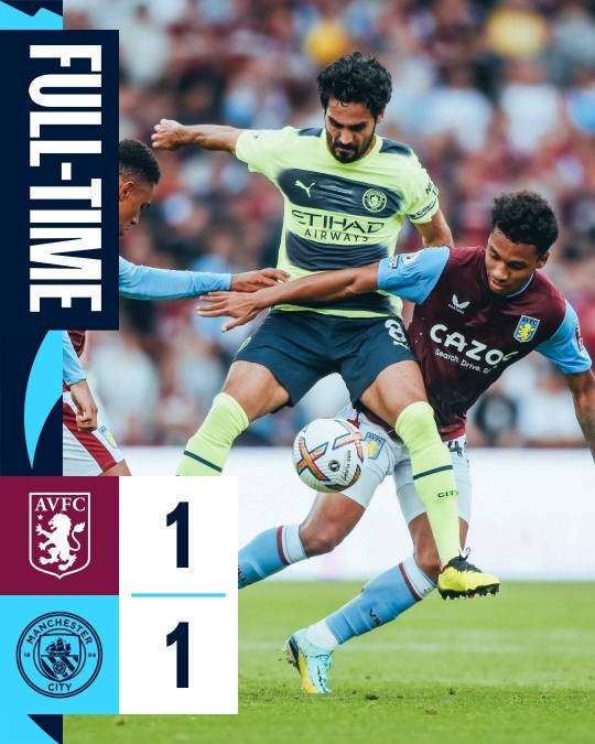 下半场易边再战,德布劳内再次送出美妙弧线球助攻哈兰德破门,但此后德布劳内的任意球击中横梁,错失扩大比分的优势,随后莱昂-贝利劲射为维拉扳平比分。最终,曼城1-1被维拉逼平。