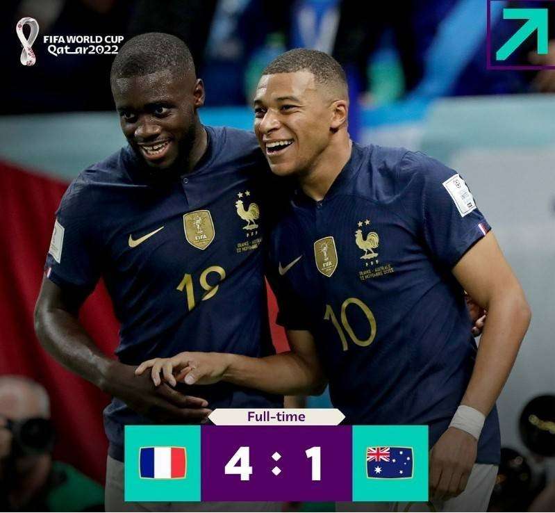 易边再战,第68分钟,登贝莱右路传中,姆巴佩禁区内头球破门,收获本届世界杯首球。第72分钟,姆巴佩左路传中,吉鲁禁区内头球破门,锁定胜局。全场比赛结束,法国4-1大胜澳大利亚。