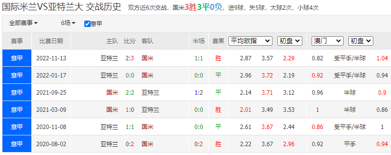 历史战绩:近6次交锋,国际米兰3胜3平0负。