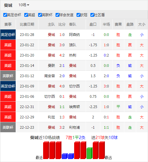 热刺在上场正式比赛中,足总杯3-0大胜普雷斯顿,孙兴慜梅开二度,新近加盟的丹朱马首秀就有进球。冬窗关窗前,波罗加盟,多赫蒂离开。联赛积分榜上,本轮前热刺11胜3平7负积36分排名第5。本赛季热刺的表现起伏较大,联赛近5个主场1胜4负发挥不佳。此外热刺联赛进攻依旧抢眼,前21场比赛打进40球,场均接近2球,仅次于曼城和阿森纳,但31个的总失球排名第英超第13位,这样的防守表现显然不能令人满意。近期,主帅孔蒂因为手术,不会在场边指挥。凯恩本赛季联赛已经打进16球,射手榜上仅次于哈兰德。本场伤停看,小卢卡斯将缺席比赛。往绩看,热刺联赛主场面对曼城,近期3连胜。