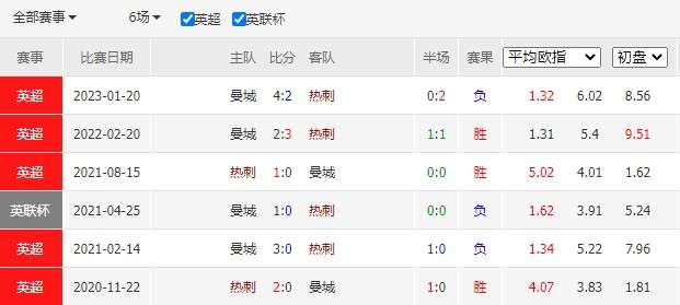 历史战绩:近6次交锋,热刺3胜0平3负。