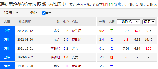 历史战绩:近3次交锋,萨勒尼塔纳0胜1平2负。