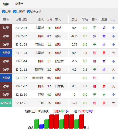 朗斯本赛季打出黑马表现,力压摩纳哥等豪强排在法甲第3名的位置。球队在22轮联赛结束后拿下13场胜仗,并且不败率达到91%,与大巴黎并列联赛最高,足见球队的状态之稳定。在冬歇后,球队9场比赛4胜4平1负,甚至有在主场大胜巴黎的惊人表现。但是要注意的是,球队近期的状态有所下降,已经连续3轮联赛未能获胜,甚至在主场不敌排名中游的尼斯。此外球队的另一特征是作客表现相当顽强,过去11个联赛客场,球队取得7场平局并且只有1场失利,对手还是实力强悍的里尔。而球队联赛作客场均0.73个丢球,也是仅高于巴黎和马赛。