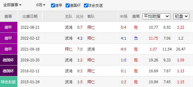 历史战绩:近6次交锋,拜仁慕尼黑5胜0平1负。