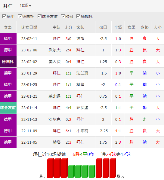 拜仁慕尼黑本赛季在德甲也遭遇到强力的挑战,仅以1分优势力压柏林联合排在榜首。利好的是进入2月球队逐步找回状态,已经收获联赛杯赛3连胜,并打入11球。同时球队在最近的10个客场收获8胜2平的优异表现,包括3球痛击巴萨。在周末3-0大胜波鸿的赛事中,球队的射正数取得12-1的巨大优势,穆勒、科曼和格纳布里先后进球,其中科曼更是在最近2轮联赛贡献了3个进球,穆勒亦有2球进账,攻击端状态相当不错。