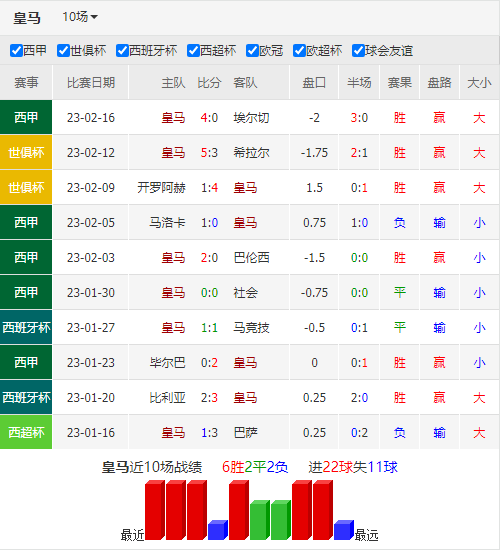 皇马暂时排在积分榜第2位,落后榜首的巴萨8分,依然有逆转夺冠的机会,球队斗志仍在。本赛季皇马的作客发挥不如主场稳健,11战8胜3负,作客场均能打入2球,但丢球也达到1个。利好的是球队近期可谓气势如虹,在世俱杯接连大胜后斩获桂冠,回归联赛又在主场大胜埃尔切,近3场比赛共打入13个进球之多,一举吐清此前作客不敌马洛卡的怨气。更让球队开心的是,伤愈归队的核心本泽马在近2场比赛打入3粒进球,状态上佳。此外维尼修斯、巴尔韦德也是连场进球,连莫德里奇也在上轮打入本赛季第4个联赛进球,为此战增添不少信心。