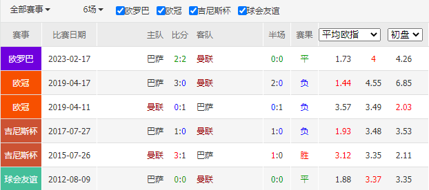 历史战绩:近6次交锋,曼彻斯特联1胜1平4负。