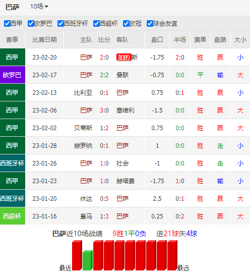 巴塞罗那本赛季否极泰来,最近10场比赛9胜1平,目前以8分优势领跑西甲,只要能保持状态就很有机会摘得联赛冠军。欧战赛场上,球队表现却未如联赛顺利,在死亡之组中被拜仁和国米压制,最终只获得小组第3降入欧联杯。首回合较量更险些不敌曼联,幸好拉菲尼亚在比赛后段进球,才保住不败表现前往老特拉福德。巴塞罗那在攻击线上损失了佩德里和登贝莱,对于战术变化是个不小的影响。幸好周末球队主场轻松击败加的斯,首回合未能进球的头号得分手莱万也在46分钟破门,打入锁定胜局的1球,状态有所恢复。