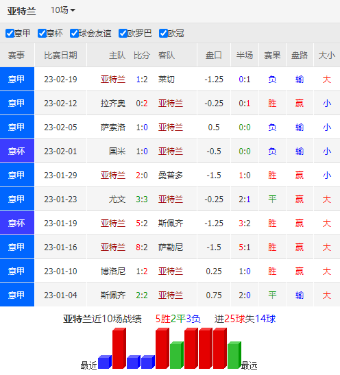 亚特兰大本赛季表现略有进步,甚至一度杀到积分榜前列,但随着赛季深入,球队表现也慢慢下滑,如今排在联赛第6名。赛季至今球队作客表现更优,12战取得7胜3平2负的优良表现,作客场均丢球不到1球。上个客场,球队便击败了欧战席位竞争者拉齐奥。不利的是最近4场联赛杯赛,球队也只取得这1胜,其余3场全部输球,且2度遭对手零封。冬歇期后的6个客场比赛,也只有2胜2平2负的一般表现。利好的是球队并无欧战任务,又已经从杯赛遭淘汰,可以一心一意应对联赛。