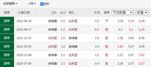 历史战绩:近6次交锋,比利亚雷亚尔5胜1平0负。
