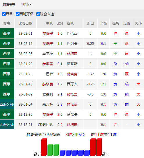 赫塔费正深陷降级区当中,幸好只落后身前的巴伦西亚1分,稍微发力就有机会逃离。该队主客场表现相仿,打法都是偏向于保守,此前10个联赛客场2胜3平5负只打入8球。该队近期受到保级压力的推动,整体状态呈现上涨趋势,上轮主场1球击败保级对手巴伦西亚后,近3轮取得1胜2平的表现,从此前5连败的阴影中走出。此外球队在最近2个客场逼平马竞,1球小负巴萨,展现出充足的抗衡力,发挥都在市场预期之上。赫塔费2位前锋于纳尔和马约拉尔已联手打入12球,包办了球队超过6成的进球数,是球队赖以得分的支柱。