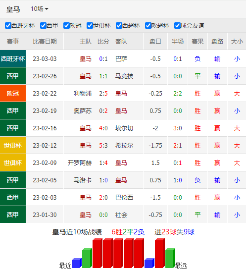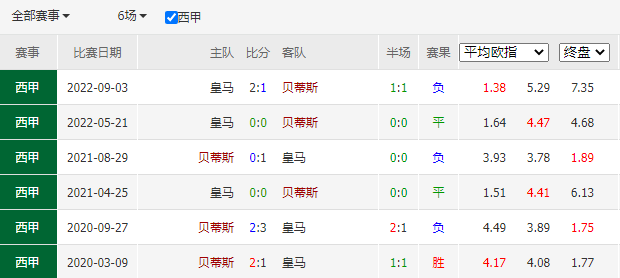 历史战绩:近6次交锋,皇家贝蒂斯1胜2平3负。